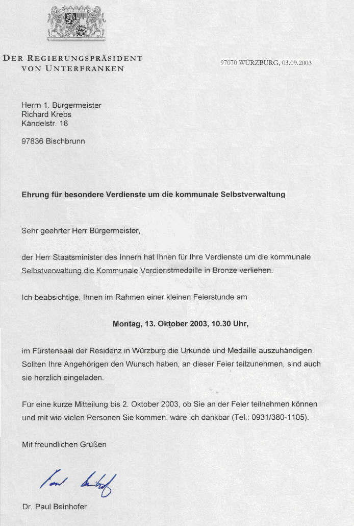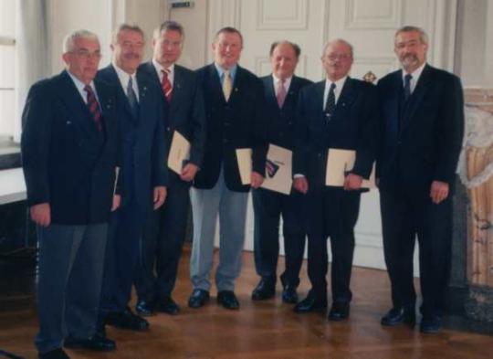 Hubert Faßnacht (von links/Stadtrat von Rieneck sowie ehemaliger erster Bürgermeister und Kreisrat), Ludwig Hauck (ehemaliger dritter Bürgermeister von Marktheidenfeld), Walter Höfling (ehemaliger erster Bürgermeister von Rieneck sowie Kreisrat), Richard Krebs (erster Bürgermeister von Blschbrunn sowie Kreisrat), Konrad Rauch (erster Bürgermeister von Neuendorf) und Robert Stollberger (ehemaliger erster Bürgermeister von Hasloch) erhielten die kommunale Verdienstmedaille. Dazu gratulierte Regierungspräsident Paul Beinhofer.