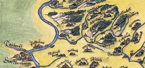 Historische Ansicht: Paul Pfinzings Karte von 1562/94 zeigt detailliert den südöstlichen Spessart mit Schollbrunn und der Markuskapelle.