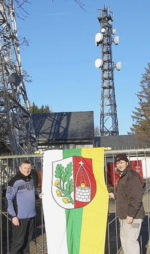 Die Bürgermeister Richard Krebs (links) und Joachim Engelhardt hissten auf dem Geiersberg die Bischbrunner Flagge.