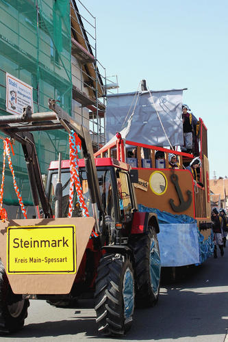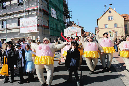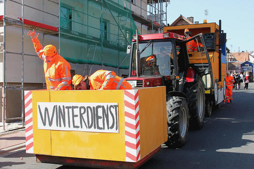 Allerlei regionale und überregionale Themen nahm sich das närrische Volk dabei vor und schüttete seinen Spott aus. Den Anfang machte der Esselbacher Spielmannszug als bunt verkleidete Gruppe. Ein Wagen suchte den Bischbrunner Bürgermeister Richard Krebs und verteilte Steckbriefe mit einem Fahndungsaufruf. Ein anderer Wagen setzte sich mit dem fehlenden Streusalz des vergangenen Winters auseinander und kündigte an, im nächsten Jahr für den Streudienst zu sorgen: »Mir schüddes nei un strawes nau, unner Salz geht niemals aus«. Ein weiterer Wagen nahm die »Dauerbaustelle A 3« aufs Korn.