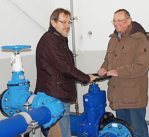 Wasser marsch: Der technische Leiter Klaus Woitas (links) und Bürgermeister Richard Krebs öffneten die Leitung.