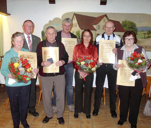Ehrung für ehrenamtliche Verdienste; von links: Gertrud Väth, Richard Krebs, Edgar Schwab, Ernst Rüppel, Carmen Krebs, Winfried Rüppel, Ingrid Engelhardt.