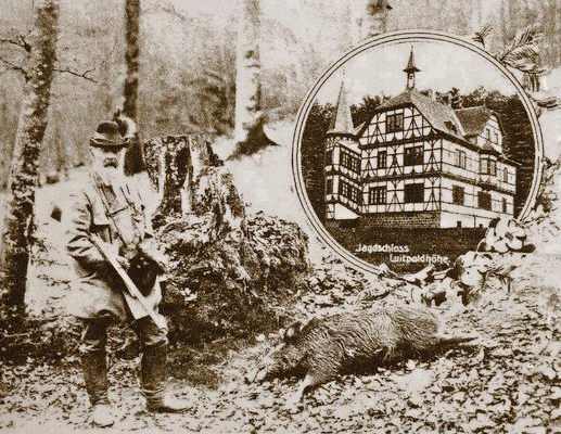 Das Luitpoldschlösschen ist verkauft: Der Prinzregent jagte gern im Spessart und diese historische Postkarte belegt dies. Sie zeigt außerdem das Jagdschloss Luitpoldhöhe, wo der Regent residierte. Unsere Aufnahme zeigt eine der Tafeln am Kulturweg des Archäologischen Spessartprojekts, die im Spessart an diese Zeiten erinnern.
