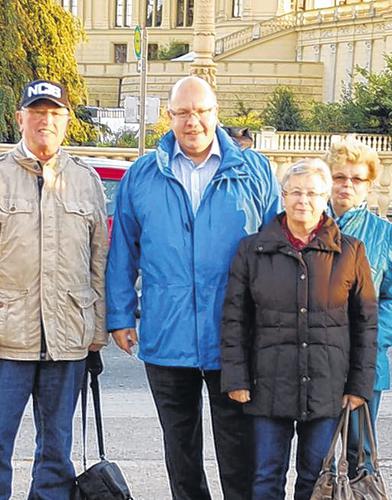 SCHWERIN/BISCHBRUNN (Andreas Köster) Unerwartetes Treffen für Bischbrunns Bürgermeister Richard Krebs (CSU) in Schwerin: Gerade in der Hauptstadt von Mecklenburg-Vorpommern eingetroffen, um die Vorbereitungen für die 21. Bürgerreise im kommenden Jahr zu treffen, traf er vor dem Schloss Bundesumweltminister Peter Altmaier (CDU). Er war nach dem anstrengenden Wahlkampf zu einem freien Tag nach Schwerin gereist und freute sich, dass er „auch ohne Krawatte“ erkannt wurde. Gerne stellte er sich vor dem Schweriner Schloss, in dem auch der Landtag untergebracht ist, mit dem Ehepaar Richard und Anna Krebs sowie der begleitenden Familie Baumgärtner zu einem Erinnerungsfoto. Bundesumweltminister Altmaier erkundigte sich nach unserem heimischen CSU-Abgeordneten und bat Krebs, Wolfgang Zöller seine Grüße zu übermitteln.