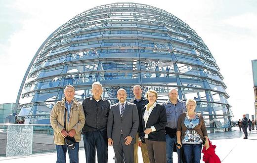 BISCHBRUNN (Redaktion Süd) Auch wenn ein vom „Wall-Street-Journal“ bezahlter DNA-Test der Doppelgänger negativ verlief: Sie fühlen sich seit dem ersten Treffen im Juni 2012 als Blutsbrüder a la Winnetou. Ein Gegenbesuch im April 2013 verlief sehr herzlich und eine weitere „Familienzusammenführung“ endete in dieser Woche: Richard T. Krebs und seine Frau Kathleen waren aus Lake Arie/Pennsylvania (USA) angereist, um an der Verabschiedung des früheren Bischbrunner Bürgermeisters und Namensvetters Richard Krebs teilzunehmen. Auch Sohn Matthew kam erstmals nach Europa. Gemeinsam bereisten die beiden Krebs-Familien die Heimat ihrer Vorfahren: Bamberg, Nürnberg, die „Grube Messel“ und das Europäische Raumfahrtzentrum Darmstadt, Wertheim, Miltenberg, die Loreley, Heidelberg, Weinheim, Schloss Neuschwanstein und die Bundeshauptstadt Berlin. CSU-Bundestagsabgeordneter Alexander Hoffmann bereitete dem Ex-Bürgermeister und seinen Gäste einen VIP-Empfang in seinem Büro und im Reichstagsgebäude (im Bild an der Kuppel). Besonders interessant war auch der Besuch im Mauer-Museum „Checkpoint Charlie“, da Kathleens Bruder zur Zeit des Umbruchs dort Dienst als Soldat getan hatte. Ein Besuch am Grab seiner Vorfahren in Aschaffenburg gehörte zum Pflichtprogramm der amerikanischen Familie Krebs. Nach drei intensiven Wochen flogen die Gäste mit vielen positiven Eindrücken über Deutschland in die USA zurück und freuen sich auf einen baldigen Gegenbesuch. Von links: Ex-Bürgermeister Richard Krebs, Richard T. Krebs, Alexander Hoffmann MdB, Sohn Matthew Krebs, Kathleen Krebs, Schwiegersohn Andreas und Anna Krebs.
