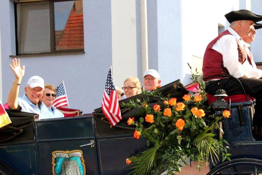 Richard Krebs (US) at left, and Richard Krebs (Germany) at right, with their family members, enjoyed a horse-drawn carraige ride at a community festival in Germany held in owner of the two look-alikes. Krebs (US) is a resident of Wallenpaupack Lake Estates.