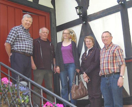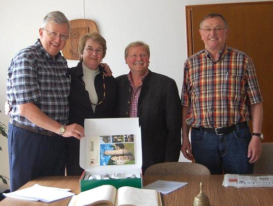 From left are Americans Richard T. and Kathleen Krebs; Herbert Ruppel, mayor of Weibersbrunn; and Richard Krebs, mayor of Bischbrunn. They are studying the archive documents for the municipality of Weibersbrunn. On the wall in the background the coat of arms of municipality Weibersbrunn.