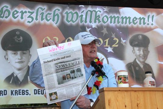The German Richard Krebs holds up a newspaper from his country showing an image from March 31-April 2 edition of The News Eagle telling the story of the two Krebs. The German headlines literally translates, “Richard Krebs sometimes two.” The banner reads literally, “Pretty welcome!!” Marktheidenfeld is a town in Lower Franconia, Bavaria.