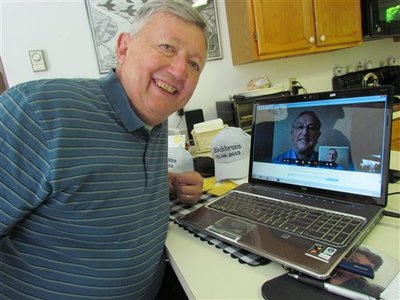 Richard Krebs of Paupack Twp., Pa., left,visits via Skype on Monday, May 28, 2012 with Richard Krebs of Bischbrunn, Germany. While doing geneology research, Krebs made an interesting discovery; in another part of the world, another man looks like him, even during many other stages of their lives; is the same age, 64, and shares the same name. They both live in rural areas. Pennsylvania’s Richard Krebs is a retired Verizon employee who serves on the boards of trustees of Keystone College and the Community Library of Lake and Salem Townships. The German Richard Krebs is the mayor of Bischbrunn, a community of about 2,000 in the state of Bavaria. The two men plan to meet in person on Saturday, June 2, 2012. (AP Photo/Scranton Times Tribune, Robbie Ward)
